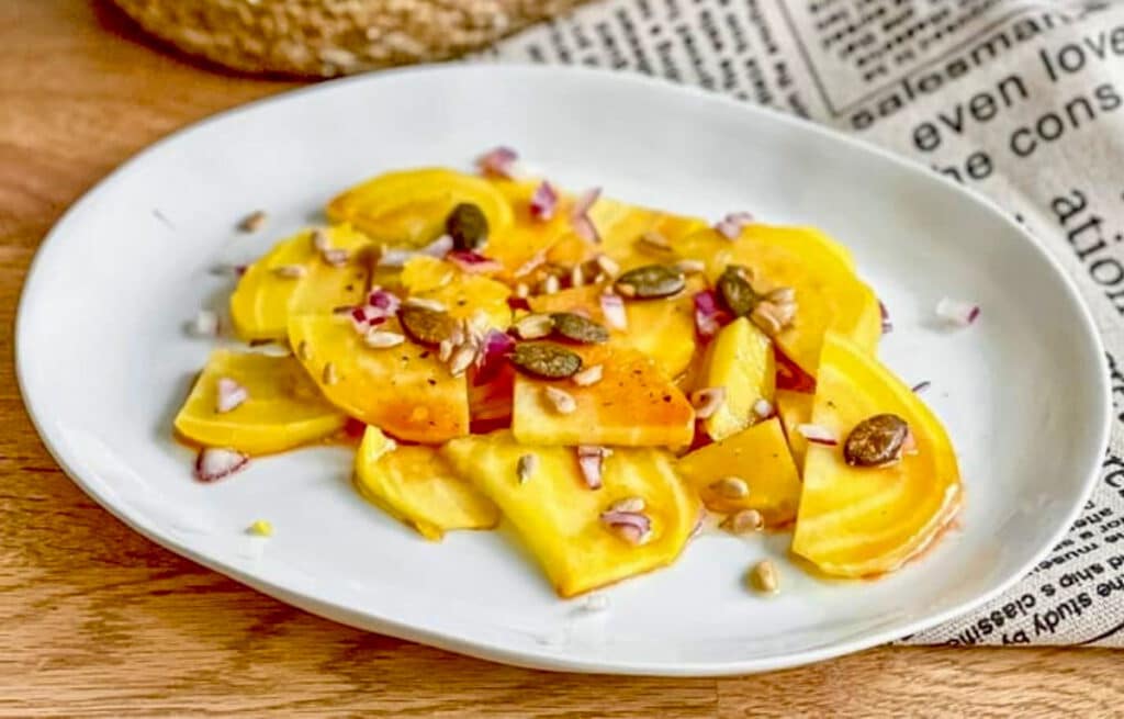 Ein kรถstlicher leichter Gelbe-Bete-Salat mit einem knackigen Kern-Topping – schnell und einfach in der Zubereitung.