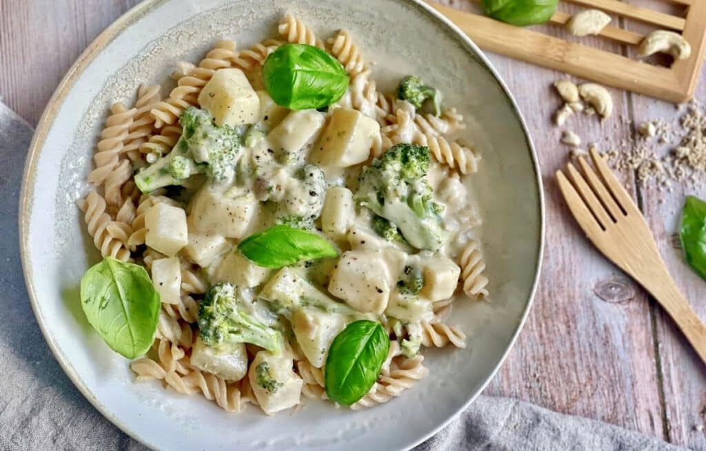 Leckere Mairübchen mit knackigem Brokkoli in einer cremigen Soße - eine raffinierte Kombination für Nudelgerichte und ein schnelles und einfaches Rezept für dein veganes Mittag- oder Abendessen - auch glutenfrei möglich.