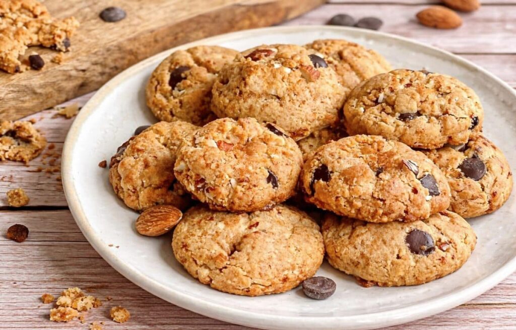 Diese leckeren Cookies sind außen schön knusprig und innen wunderbar soft. Aber Achtung: Mit den köstlichen Schokoladenstückchen und dem knackigen Mandelbruch sind sie einfach himmlisch, da bleibt es selten bei einem.