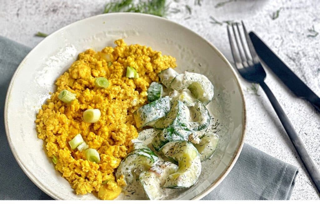 Veganes Rührei | Rührtofu mit sahnigem Gurkengemüse – einfach & lecker